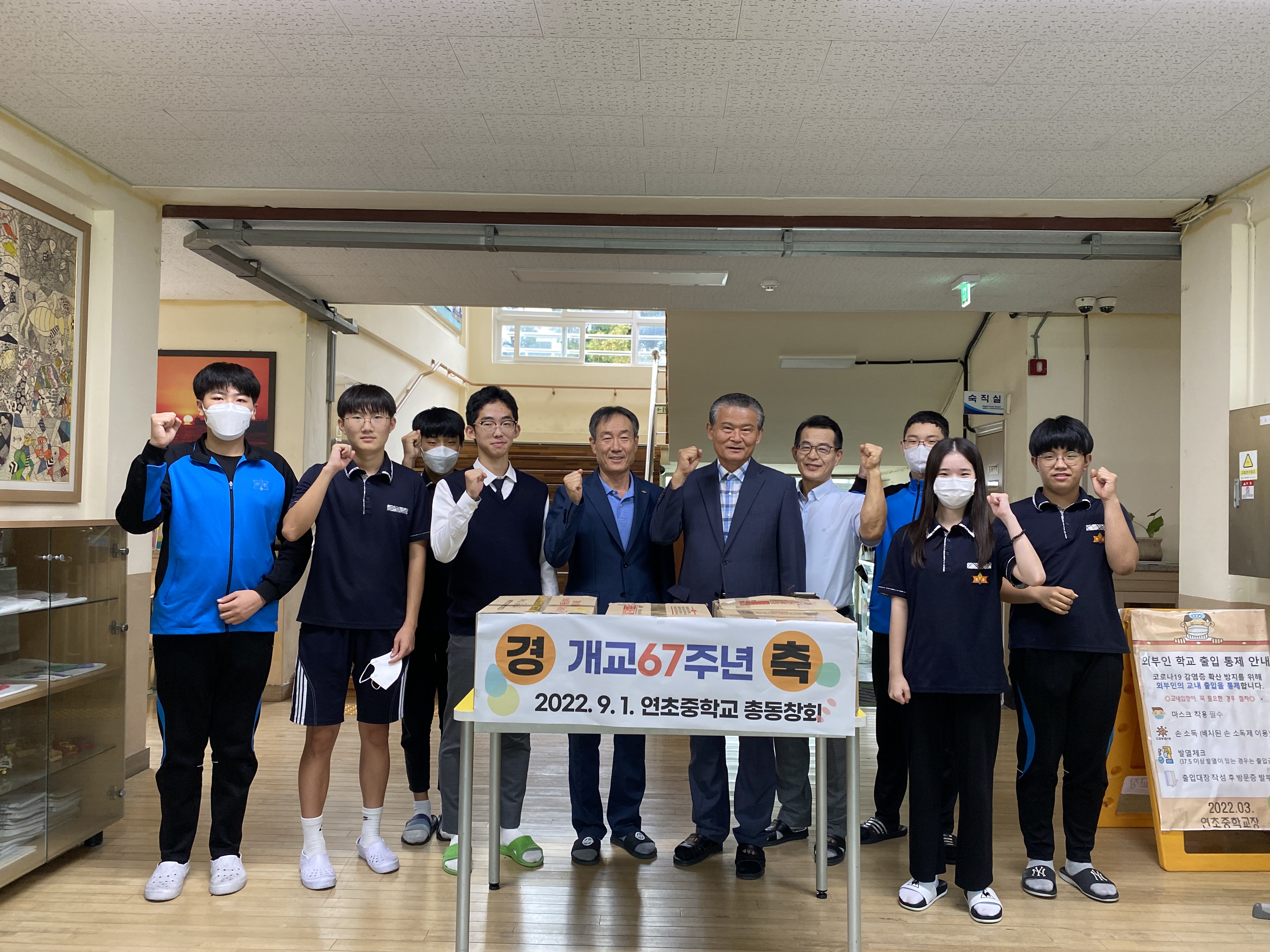 연초중학교 임원진(옥유만회장 18회, 정도환사무국장 27회)이 8월31일 연초중학교 개교 67주년(9월1일)을 축하하러 전교생과 교직원에게 줄 간식과 함께 방문하였다.